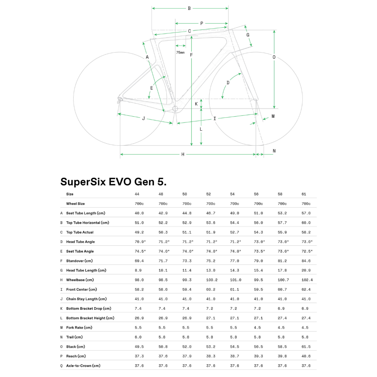 SuperSix EVO Carbon, integrated crown race, 12x100mm thru-axle, flat mount disc, internal routing, 1-1/8" to 1-1/4" Delta steerer, 55mm offset (44-54cm), 45mm offset (56-61cm)